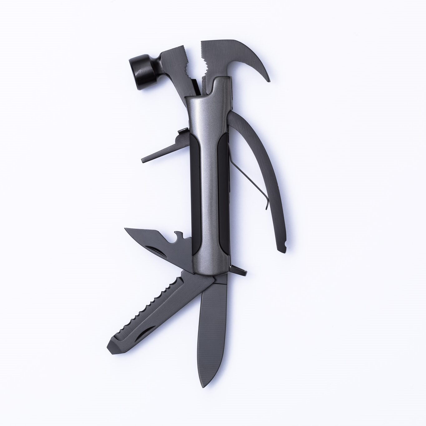 The stainless steel 8-function tool including a hammer and a nail pulling tool which are a non-standard element of any multifunction tools. Packaged in a polyester sack.