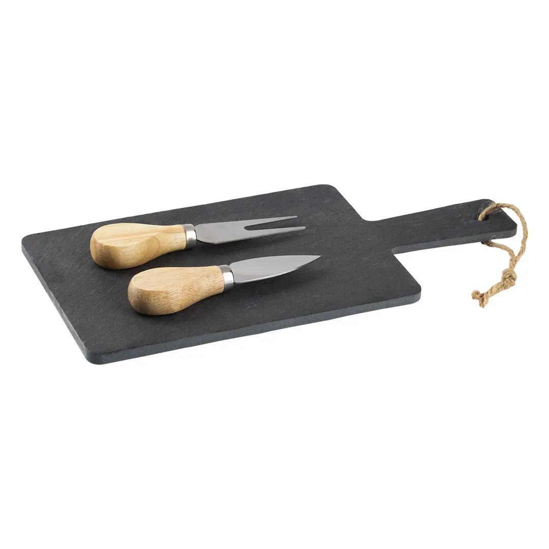 Slate stone serving platter and cheese set with wooden handles, 3/1